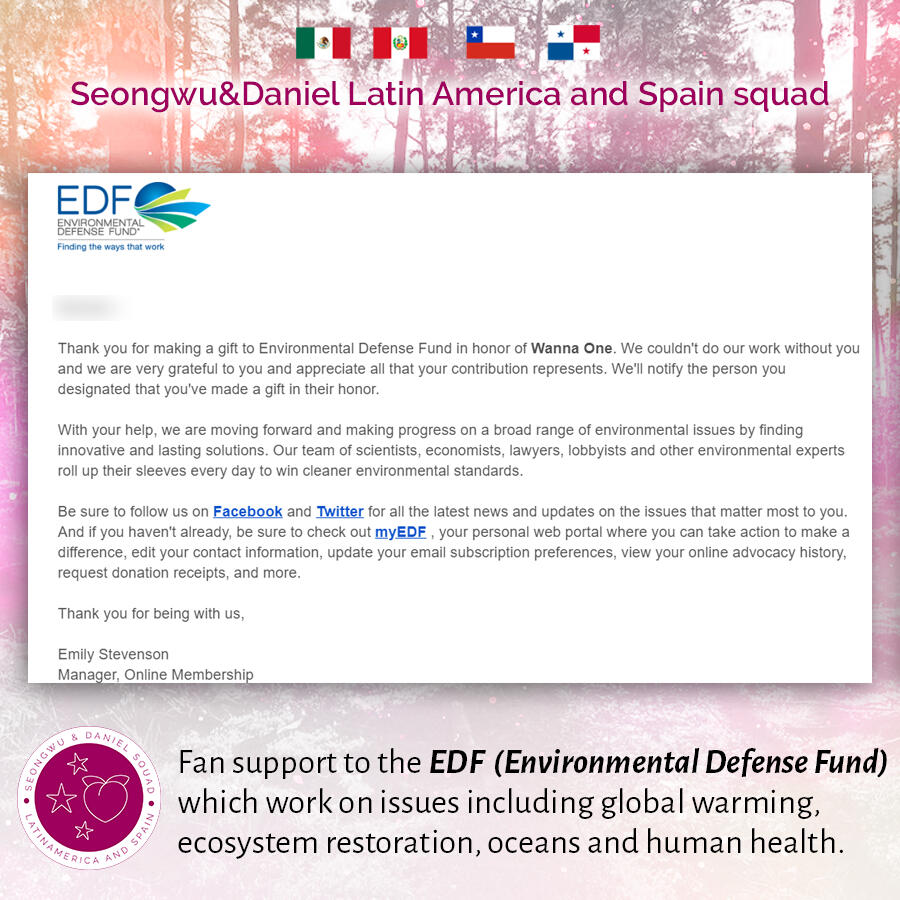 #2 To celebrate the 2nd anniversary of them as Wanna One, and as a token of gratitude for their impact in our lives, the squad donated to Environmental Defense Fund and Latin American Youth Center.